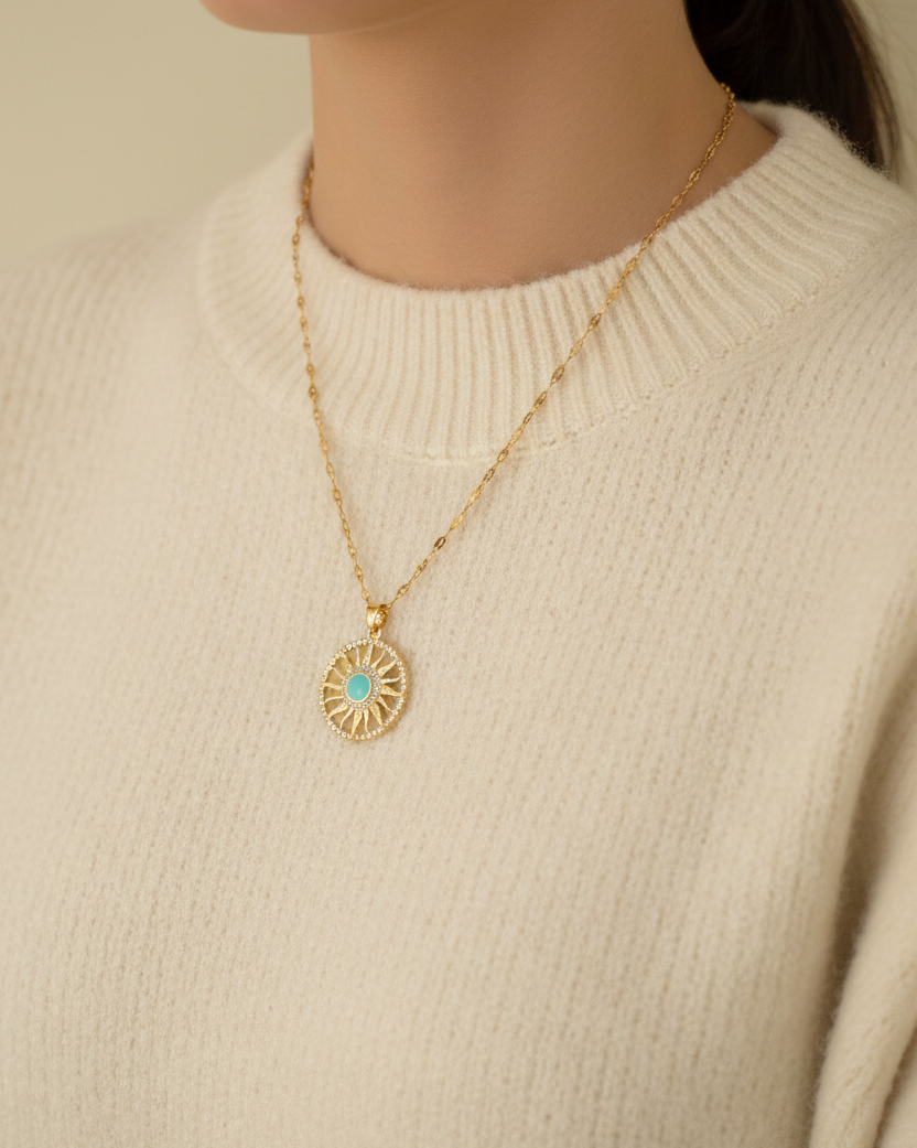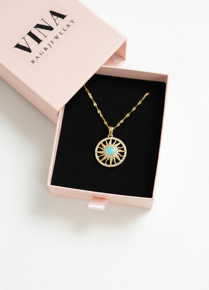 Vina Bag & Jewelry – Özel Tasarım Güneş Figürlü Turkuaz Taşlı 316L Çelik Kolye