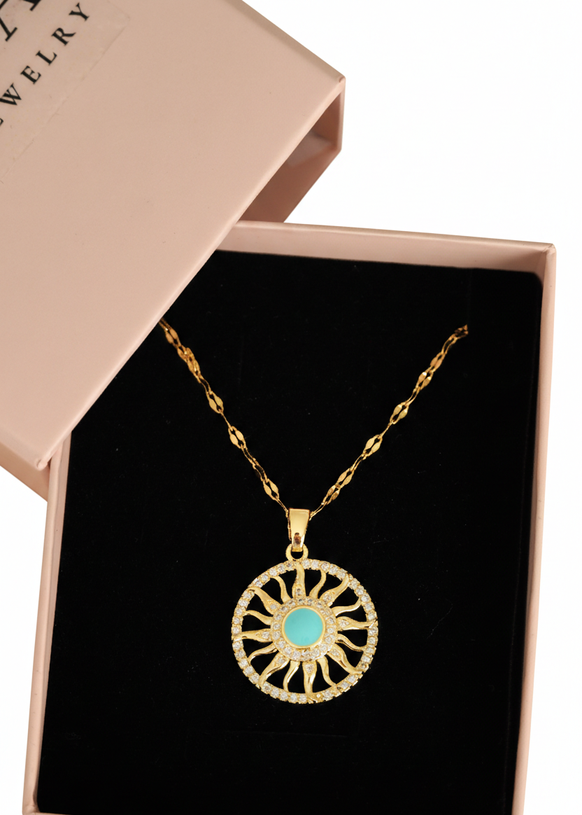 Güneşin enerjisini ve turkuazın huzurunu boynunuzda taşıyın! Vina Jewelry koleksiyonunun en sevilen parçalarından biri olan bu güneş figürlü kolye, ortasındaki turkuaz taş detayı ve çevresindeki parlak zirkon taşlarla stilinize hem modern hem de bohem bir hava katıyor.