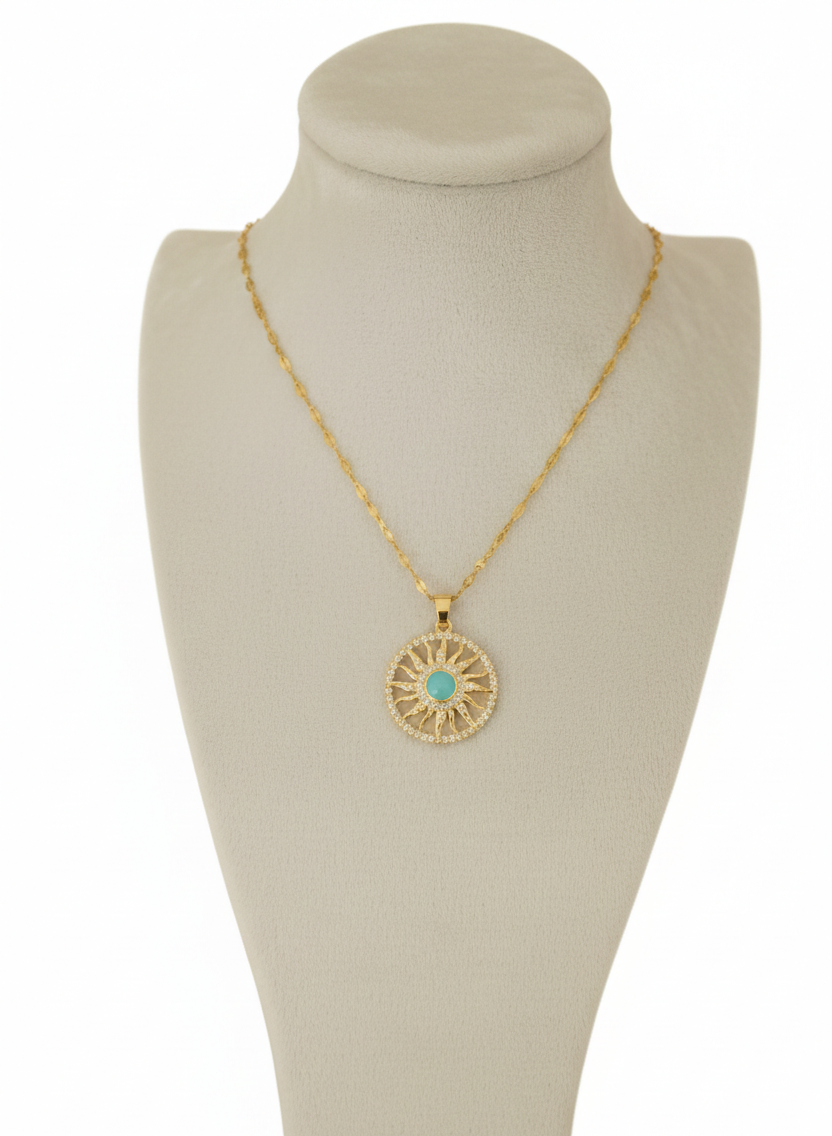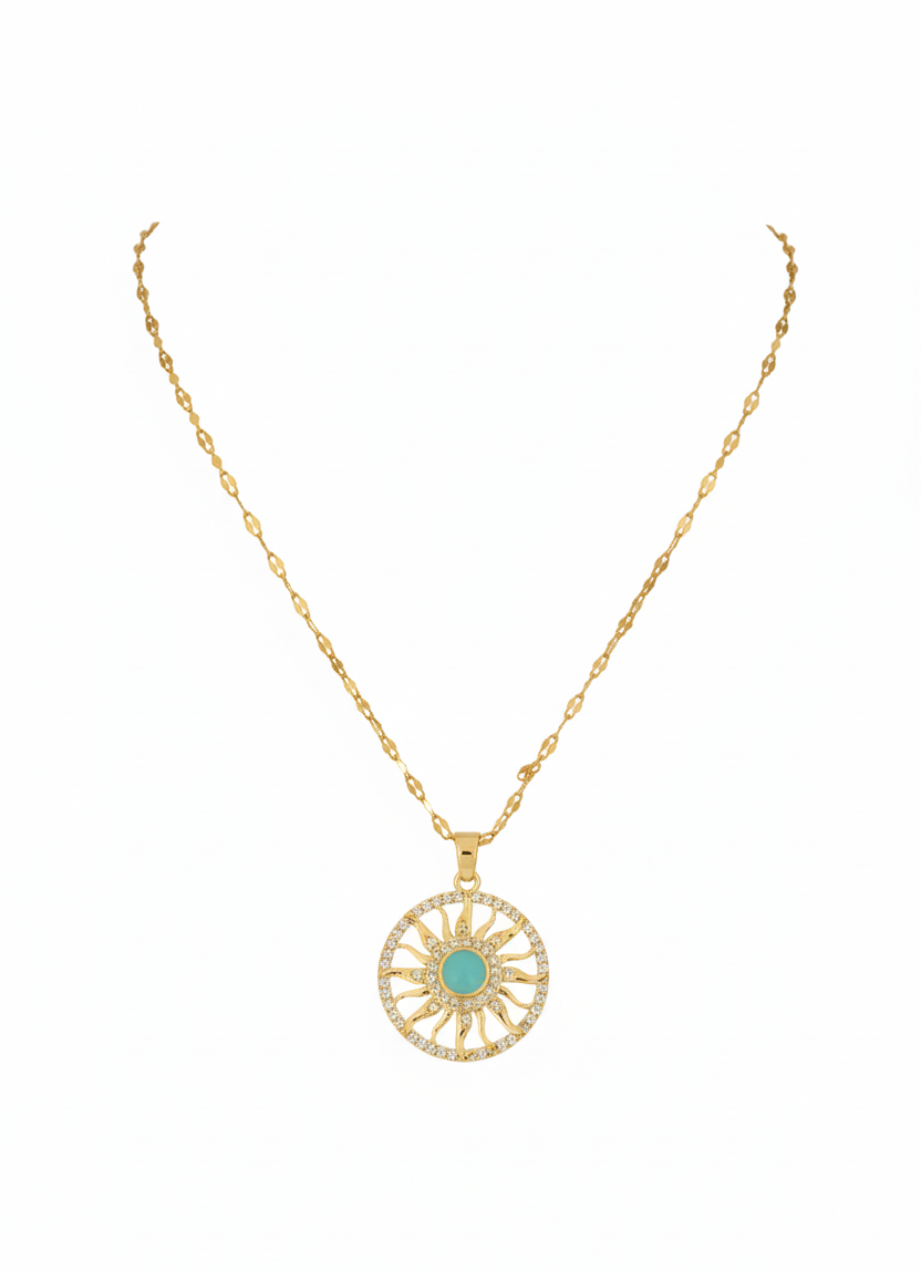 Gold Güneş Figürlü Turkuaz Taşlı Kadın 316L Paslanmaz Çelik Kolye