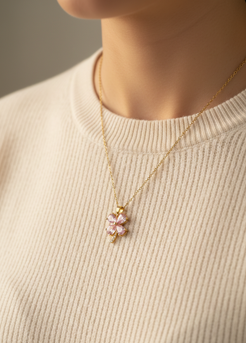 Minimal Kadın Gold Çelik Kolye Pembe Zirkon Taşlı Çiçek Yonca Figürlü- 316L Çelik