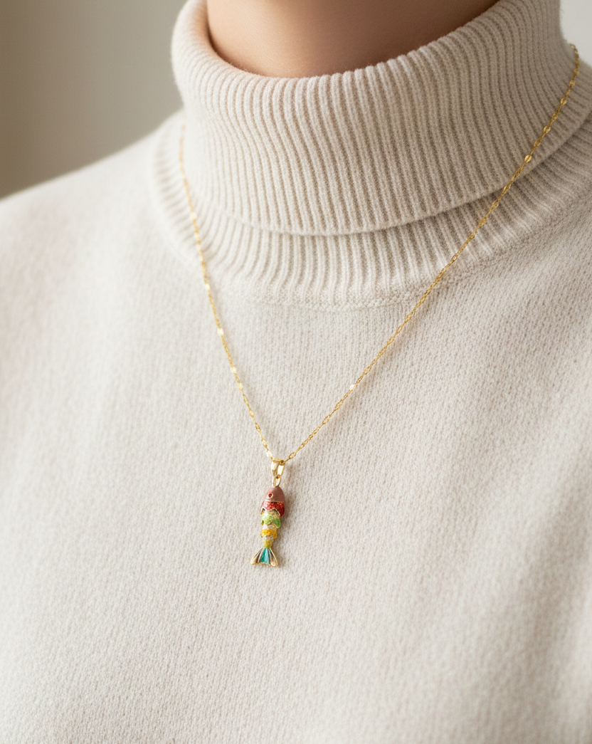 Günlük stilinize hem eğlenceli hem de zarif bir dokunuş katmak için tasarlanan bu renkli balık figürlü kolye, yüksek kaliteli çelik materyali sayesinde uzun ömürlü bir kullanım sunar. Denizin enerjisini ve zarafetini boynunuzda taşıyın.